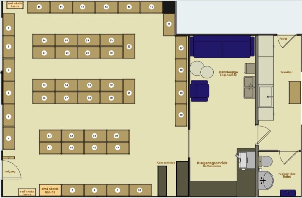 Et besøg hos små skatte skal være mere end blot salg. Vi vil nemlig etablere et lille sofaområde med mulighed for lidt leg for de små. Her er det muligt at tage en pause, give den lille mad og samtidig nye en god kop kaffe fra vores maskine. I er samtidig velkommen til at bruge vores tekøkken, når du skal varme mad eller lign. til den lille. På vores toilet er der adgang til et fint pusleområde.